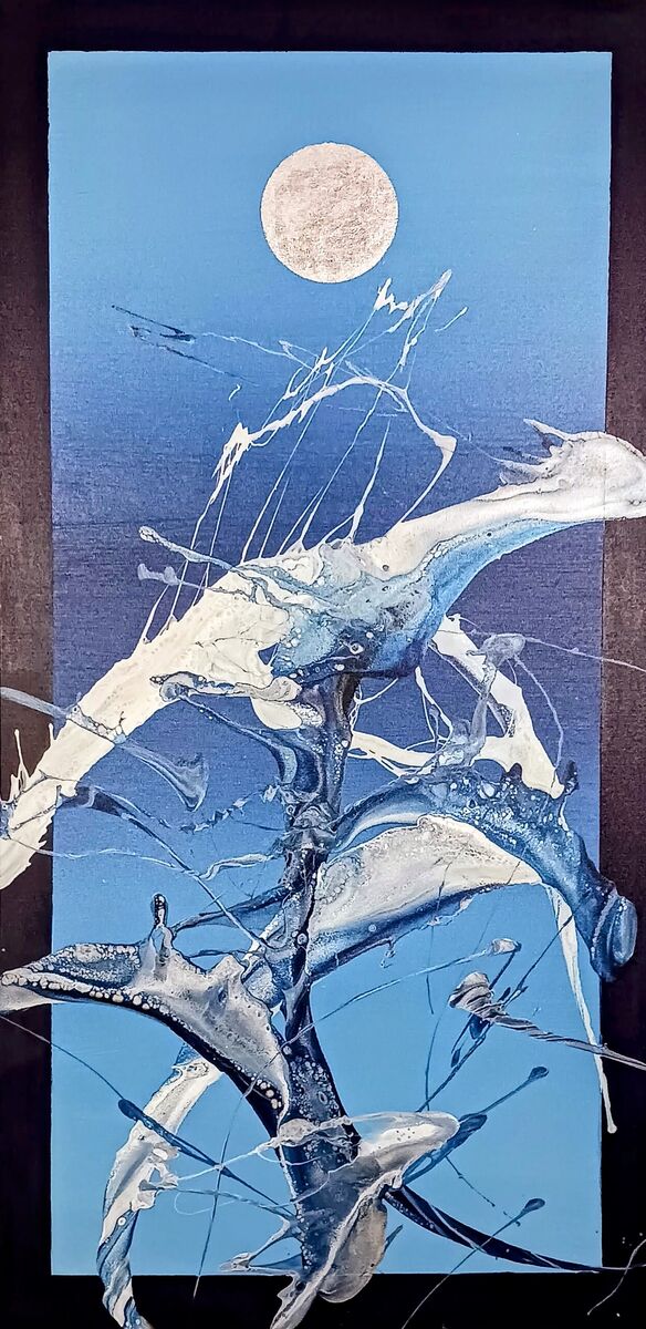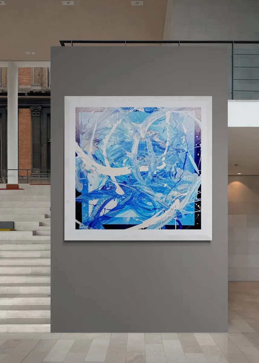 Set against a phthalo blue edge, this painting boasts a mesmerizing blue and white color scheme, with fluid brushstrokes blending shades of blue, silver, and white in dynamic gradients. The focal point emerges with intertwining hues of white, silver, and various blues, evoking the raw force and motion of waves meeting the shore.
