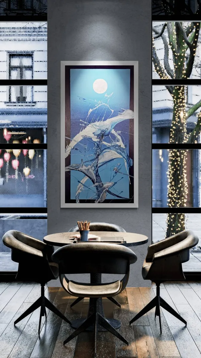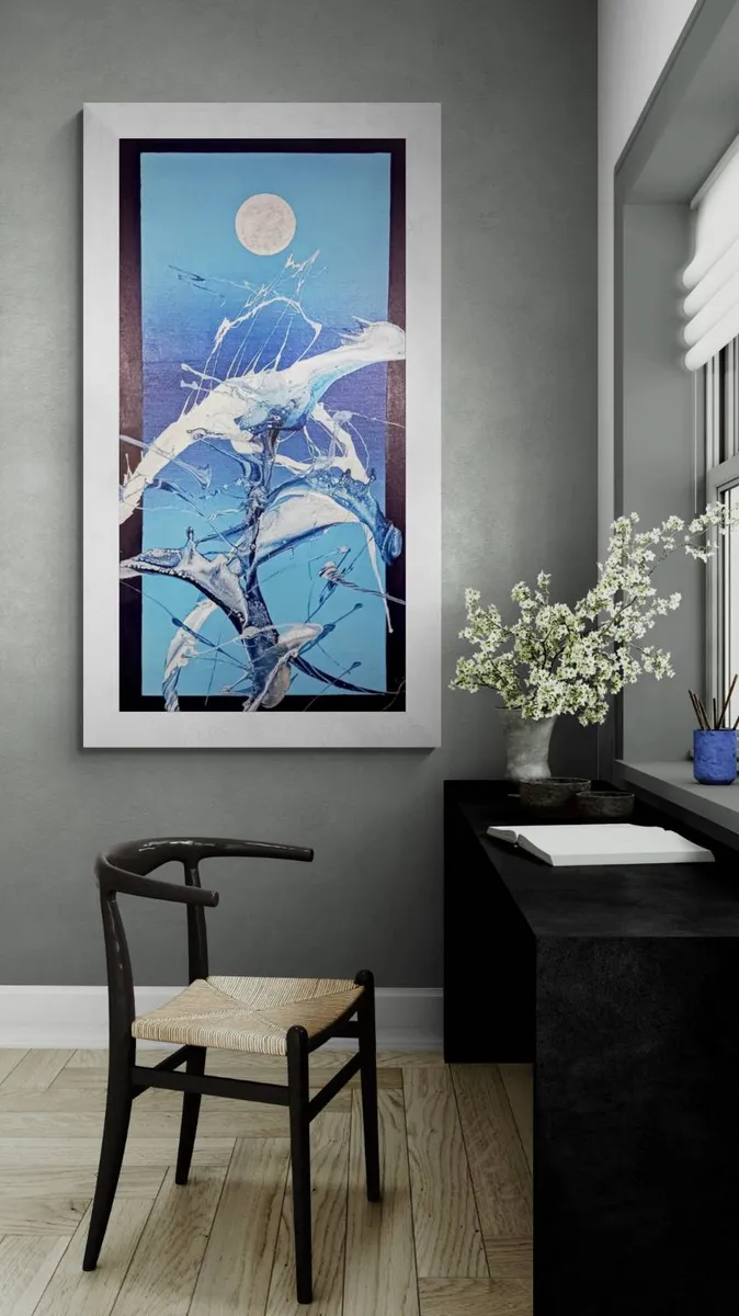 Set against a Prussian blue border, the canvas unfolds a horizontal gradient journeying from the gentle hues of light blue to the depths of midnight, before returning to the tranquil azure of dawn. At the heart of the composition gleams a delicate sliver leaf moon, casting its ethereal glow upon the scene.