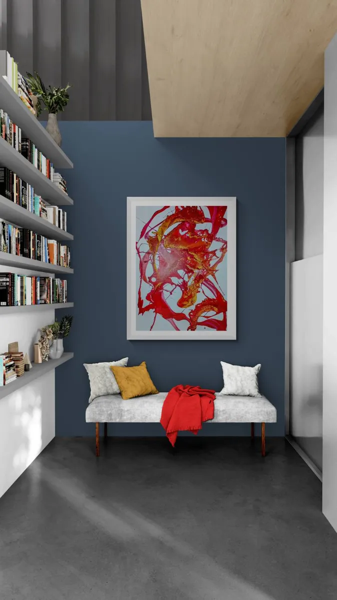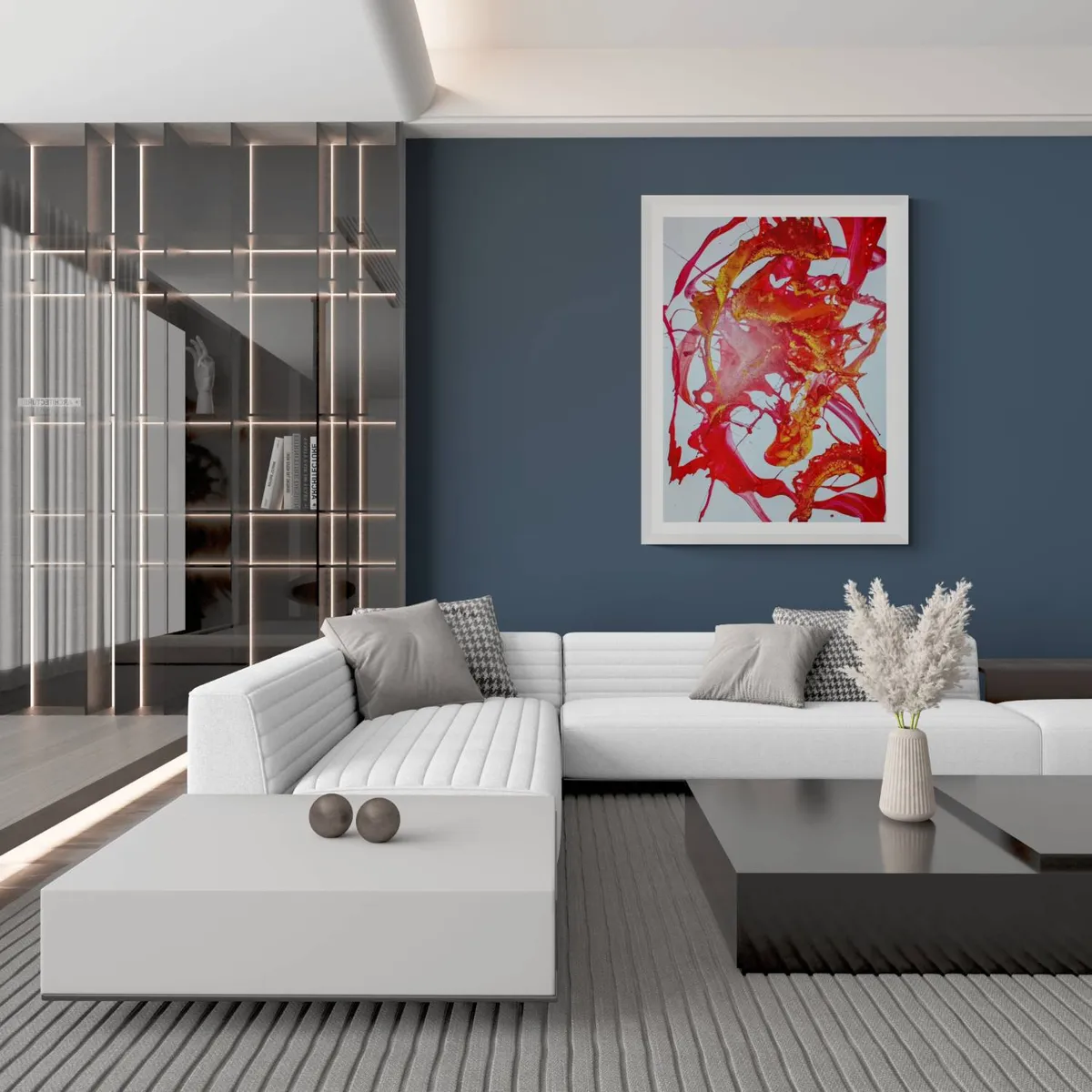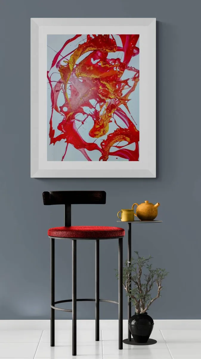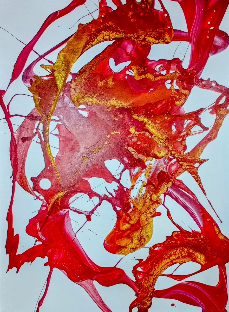 The dynamic composition captures the energy and fluidity of a dance, with each color intertwining and swirling across the canvas. The vibrant reds and oranges dominate the central area, creating a sense of intense heat, while the yellows and golds add depth and luminosity.