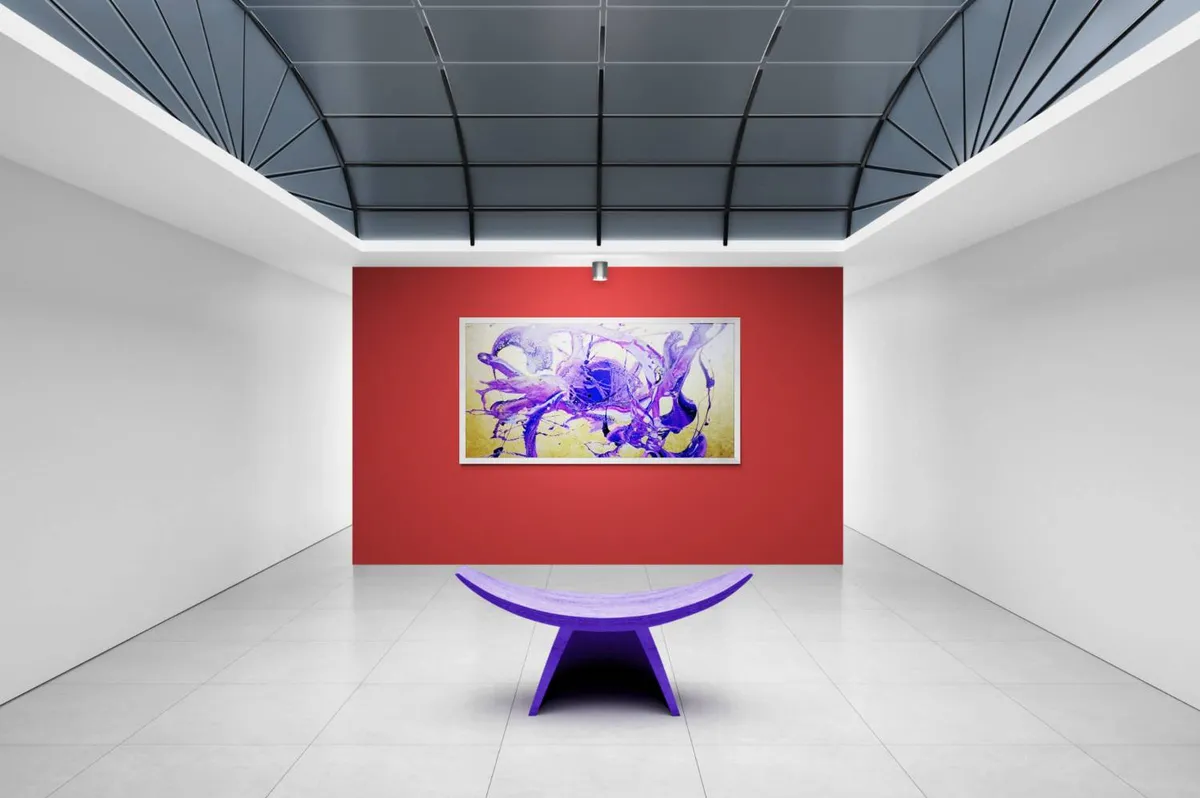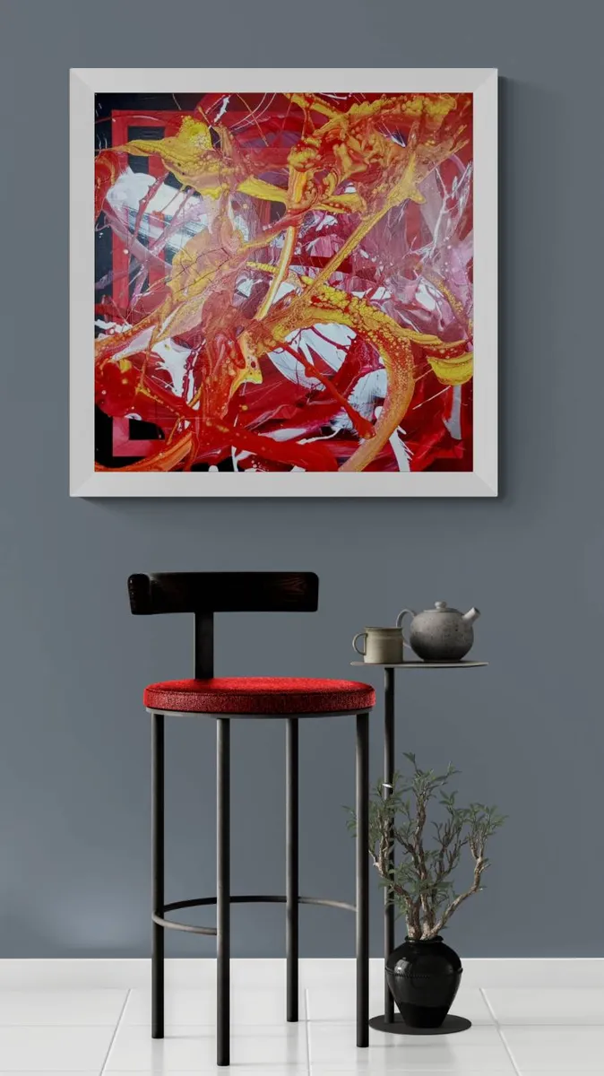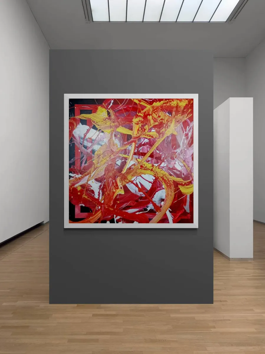Interlacing flames, rendered in hues of red, orange, yellow, white, and gold, dominate the composition. These flames twist and weave through the textured underpainting, creating a sense of motion and vitality. The interplay of colors and textures evokes the sensation of a flower in bloom, its petals unfurling with radiant energy. The flames not only create a visual rhythm but also interact with the background, making the entire canvas seem alive and pulsating.