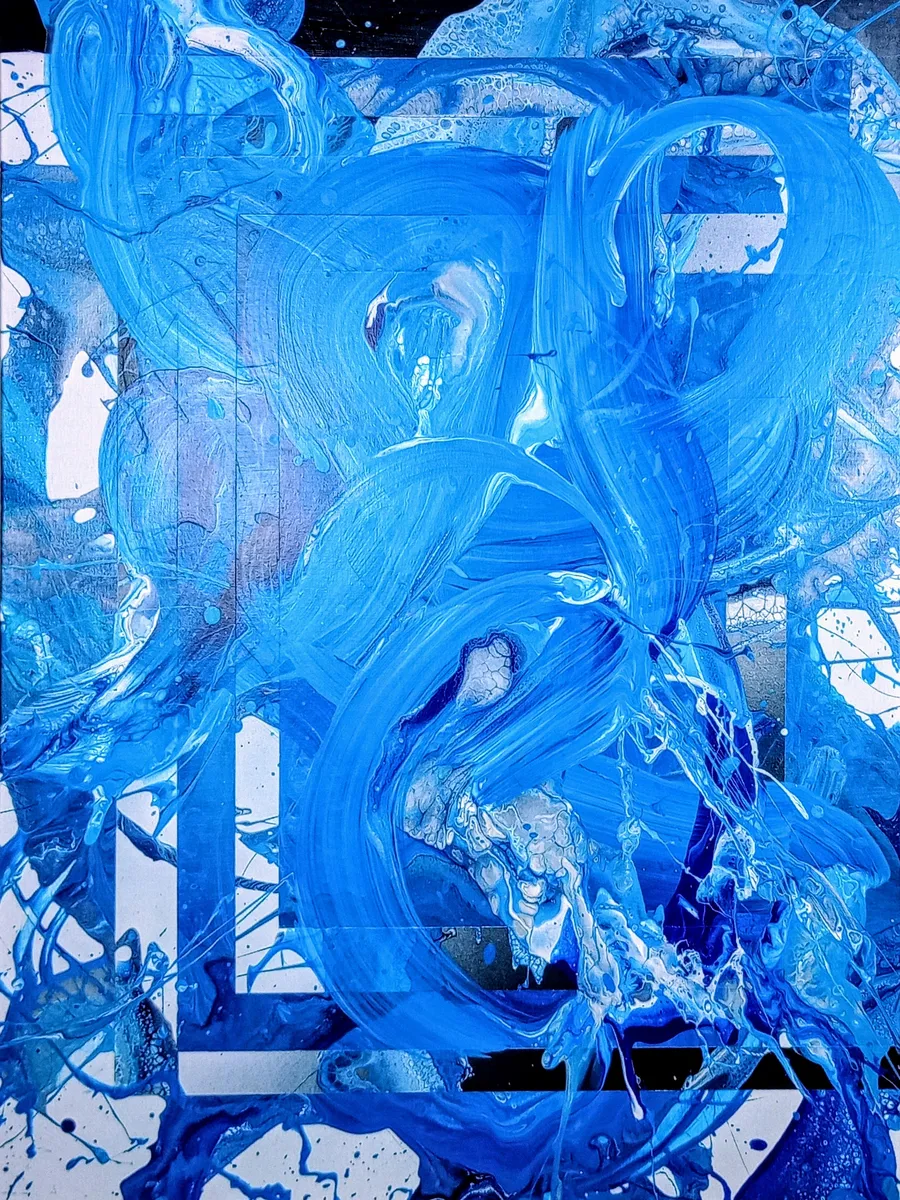 These layers are complemented by a gradient transitioning from black to gray to white, symbolizing the fluid nature of water as it flows and changes form. Swirling through this gradient are intricate patterns of silver, white, and various shades of blue, creating an impression of water in constant motion.