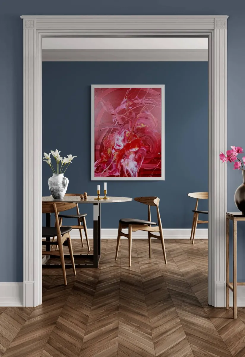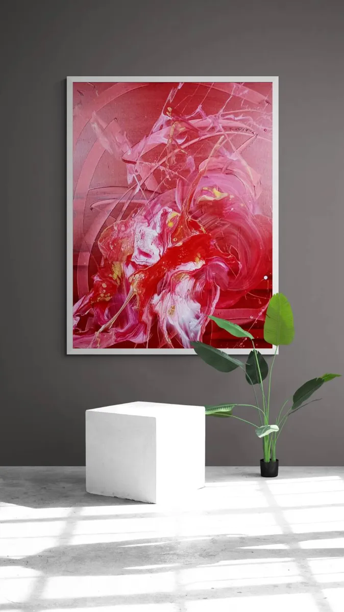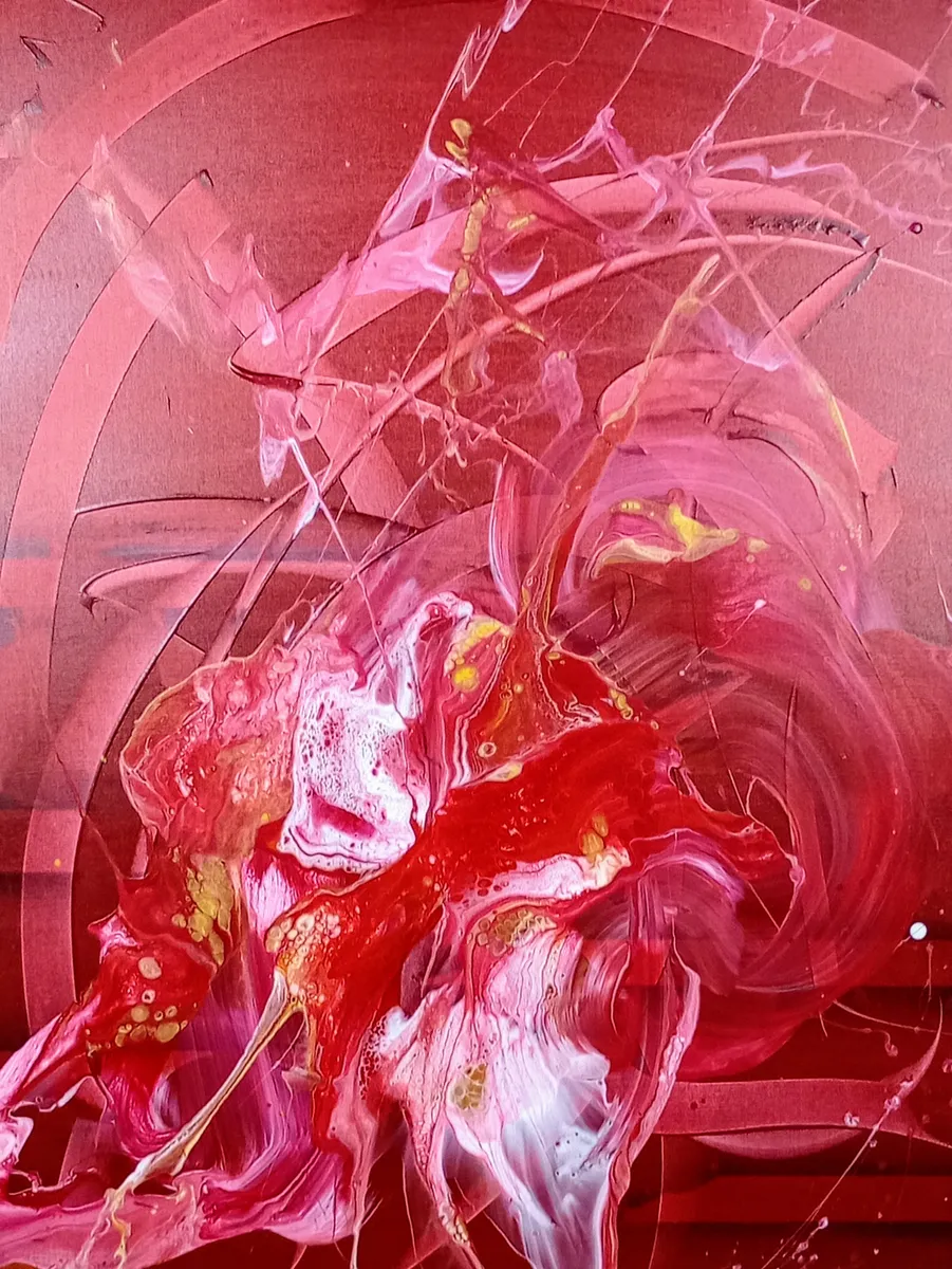 Fire Blossom is an evocative abstract piece that captures the delicate beauty and raw energy of nature. The canvas is awash in a subtle red gradient, with arching strokes that create a sense of movement and depth. The focal point is a radiant bloom, composed of fiery hues—vibrant reds, oranges, and yellows—set against touches of white. Swirling brushstrokes bring a dynamic energy to the piece, evoking the vitality of a flower blooming amidst flames. This composition balances softness with power, inviting viewers to contemplate the interplay of fragility and strength.