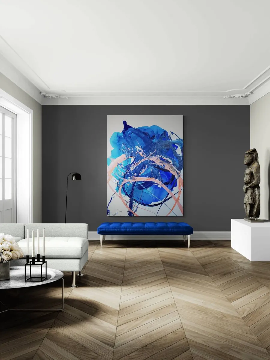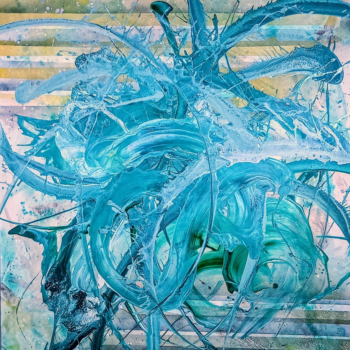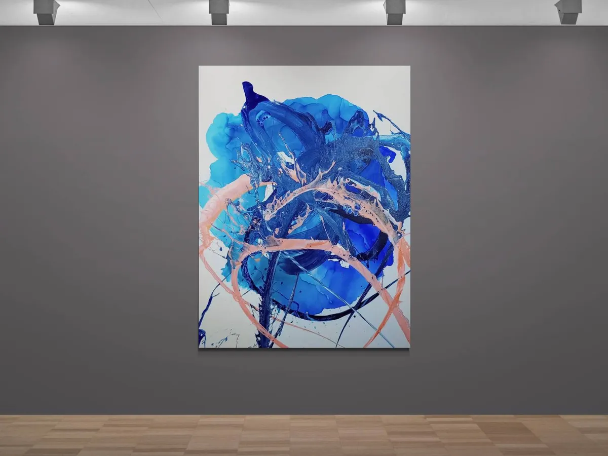 Mixed media painting blends fluid alcohol ink techniques with dynamic, layered brushstrokes. A serene background of shifting blues with subtle silver hints sets the tone, while sweeping strokes and splashes of blue, silver, white, and orange in the foreground add vibrant depth and energy, evoking the ephemeral beauty of clouds in motion.