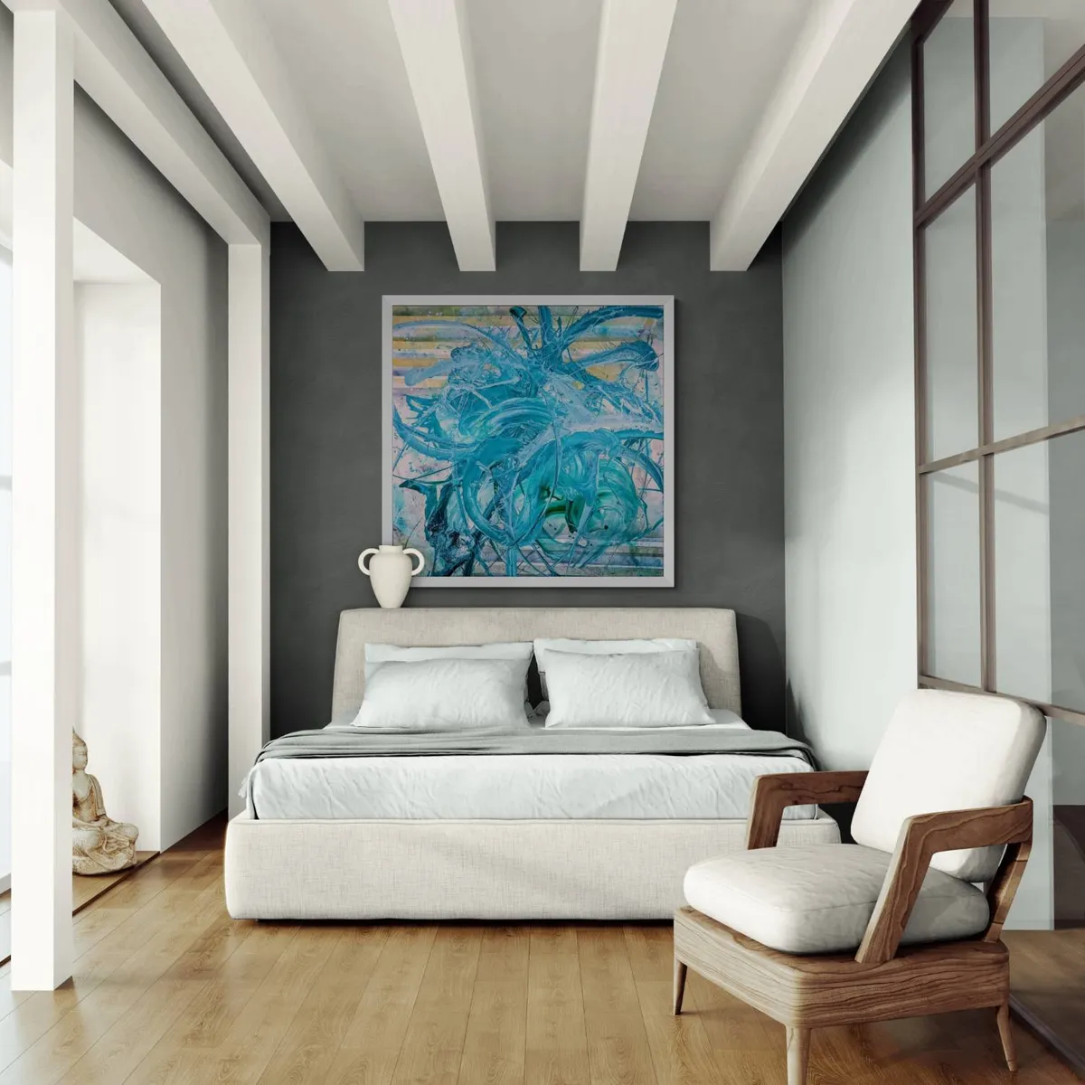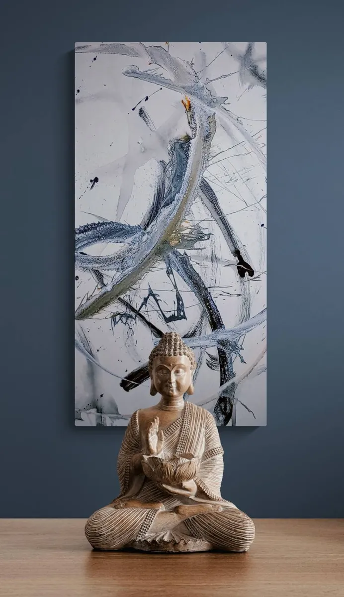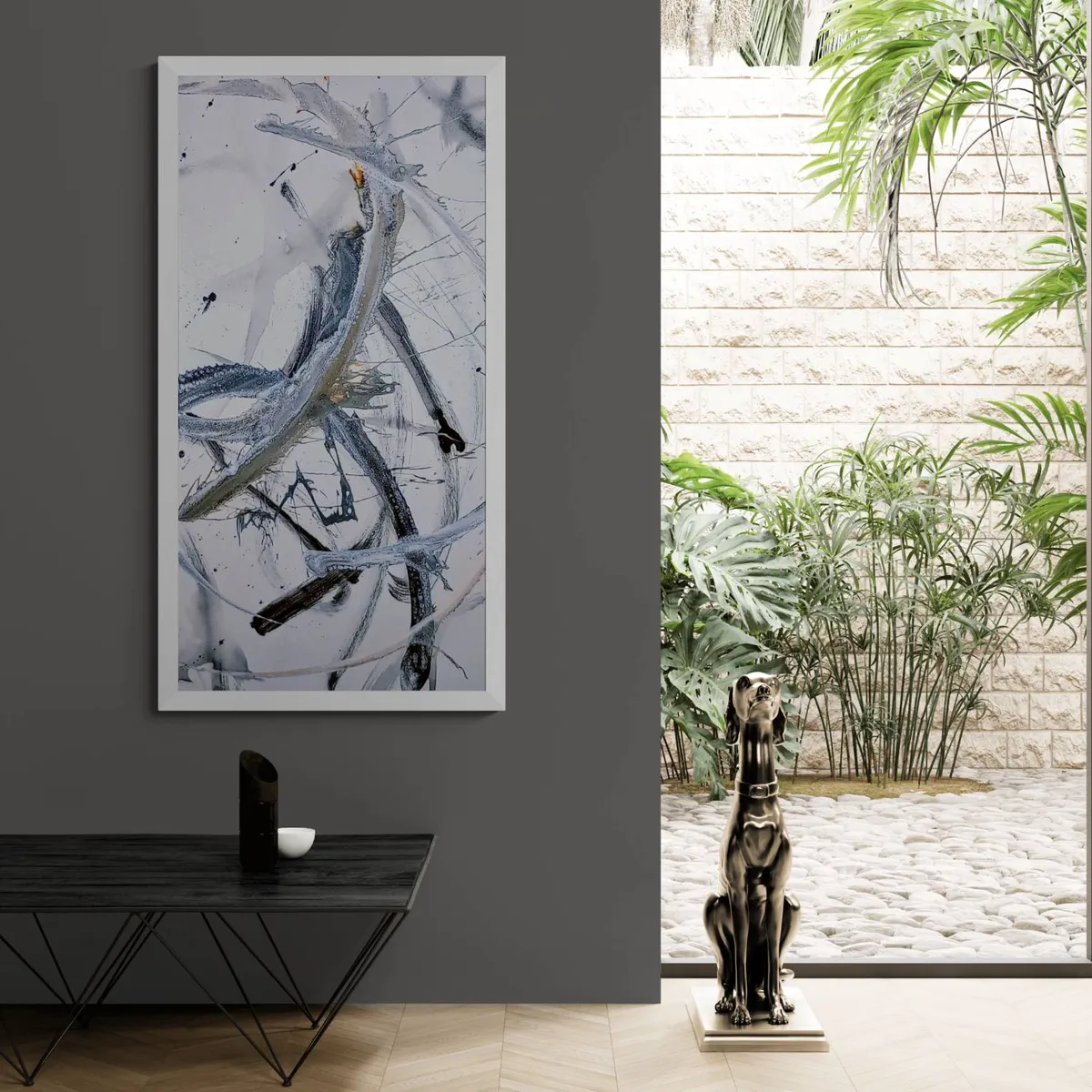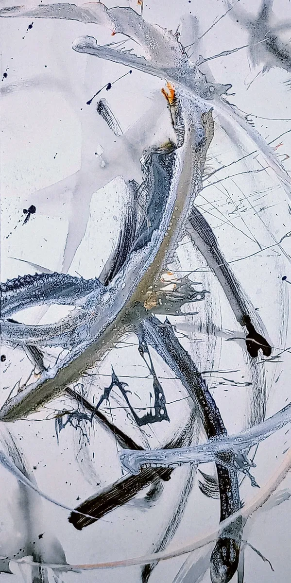 Captures the tension between presence and disappearance. A metallic graphite backdrop slowly recedes, allowing bursts of black, white, and orange to assert themselves across the surface. Shimmering layers and bold contrasts create a sense of movement suspended in time—like echoes lingering just before they fade.