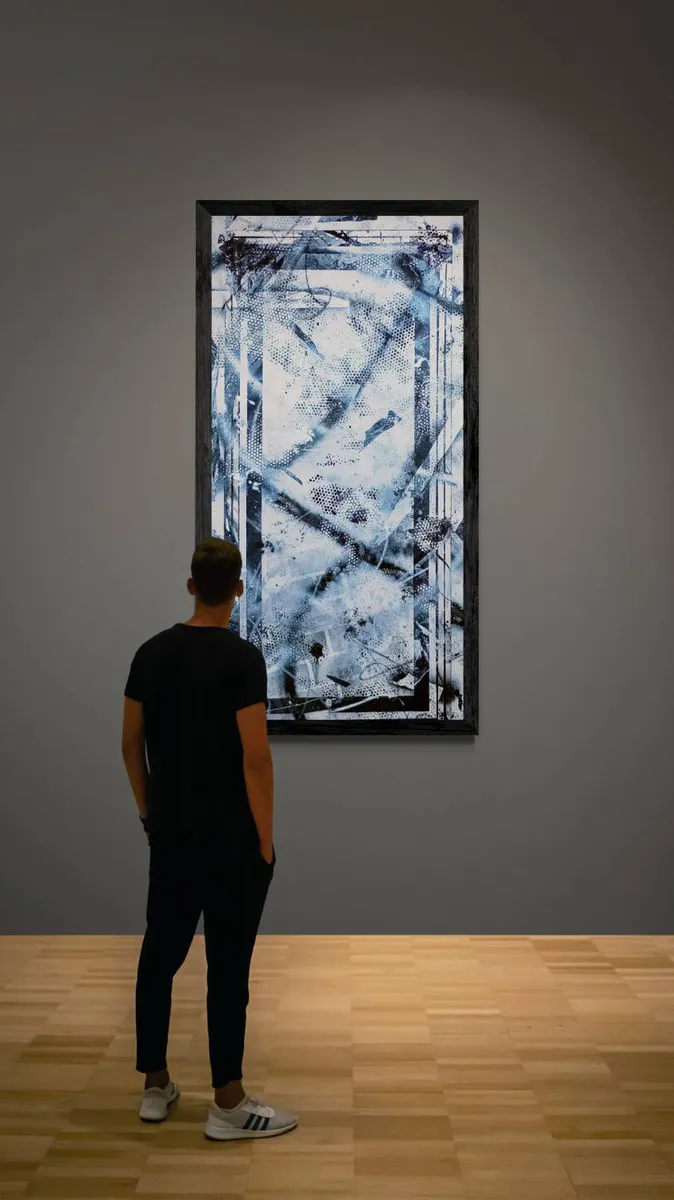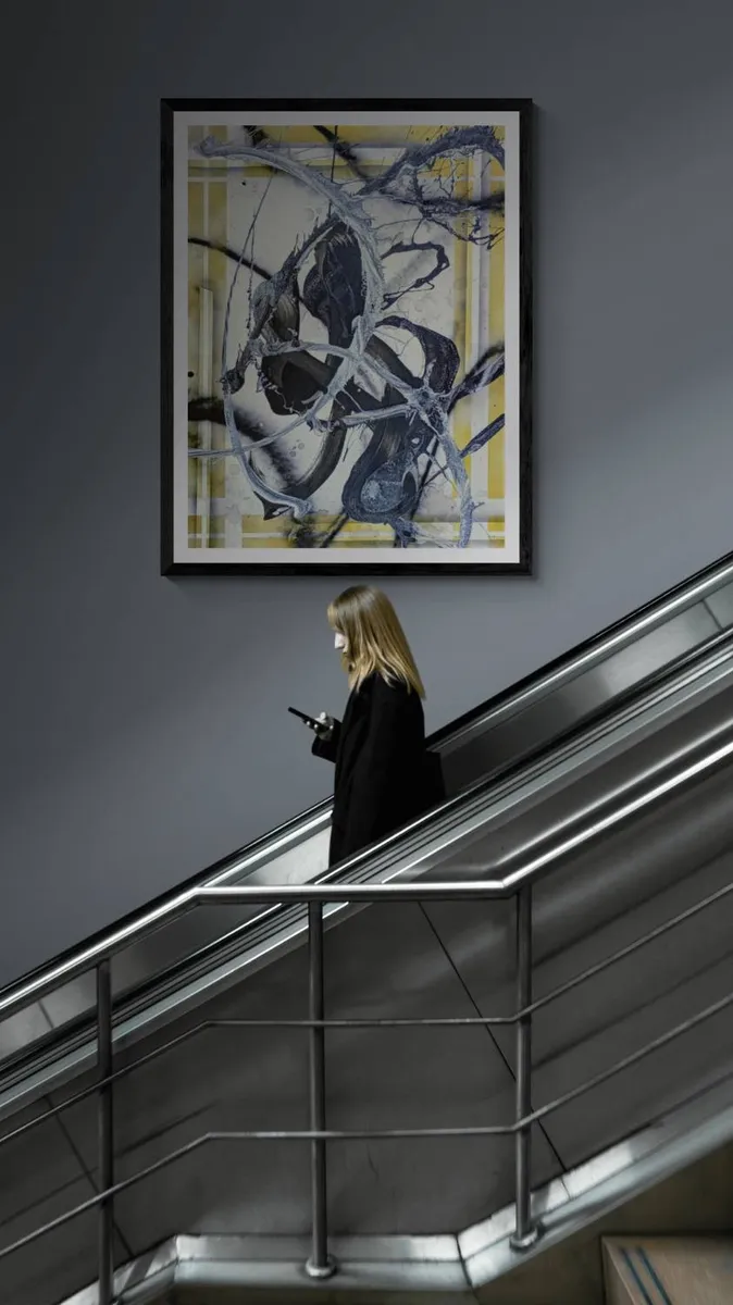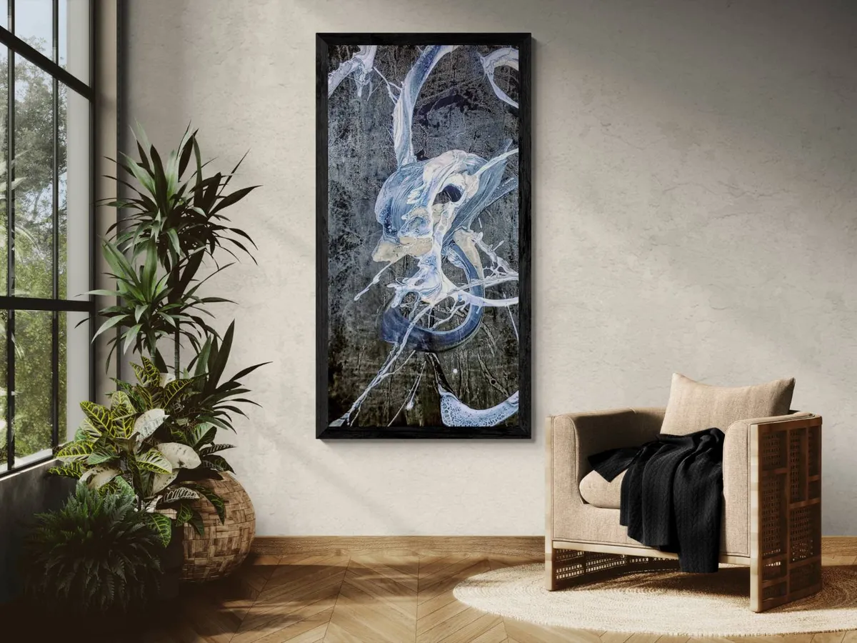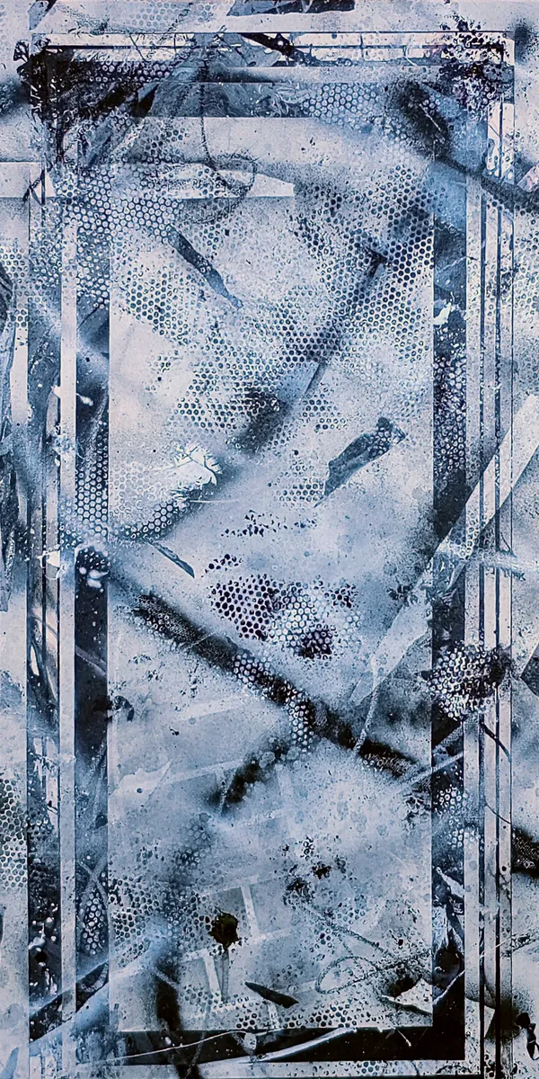Urban Excavation explores the hidden layers of the modern city through a dynamic interplay of black, white, and silver. Franklin uses textured acrylic, gestural oil pastel, and atmospheric spray aerosol to evoke the raw energy of urban life—its grit, history, and resilience. Silver accents hint at light within the shadows, inviting viewers to reflect on the unseen foundations that shape our environments.