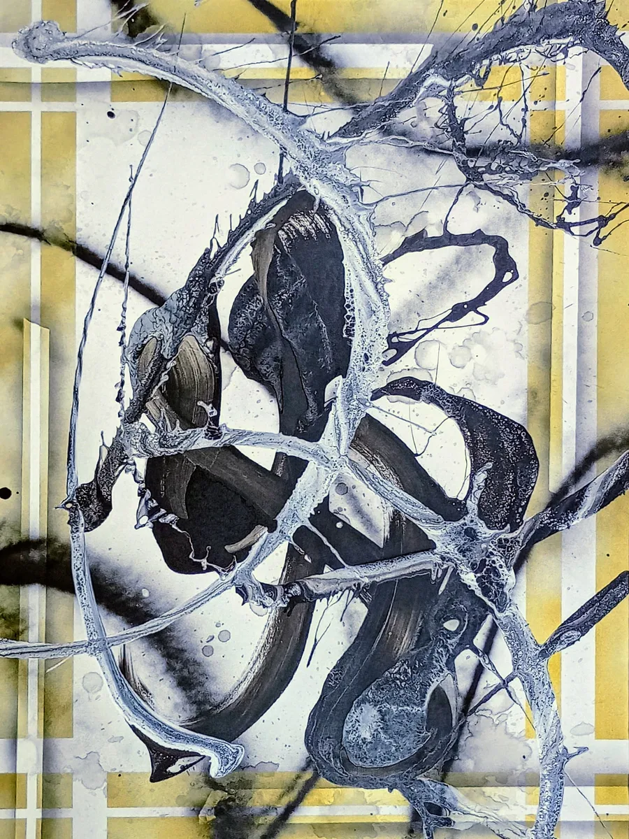 Framed by intersecting gold and white lines, bold currents of black and pearl white surge across the canvas in a striking, fluid composition. The movement suggests a state of transformation—an emergence from one form into another. Layers of energy and contrast give the piece both tension and harmony, capturing the essence of growth, resilience, and becoming.