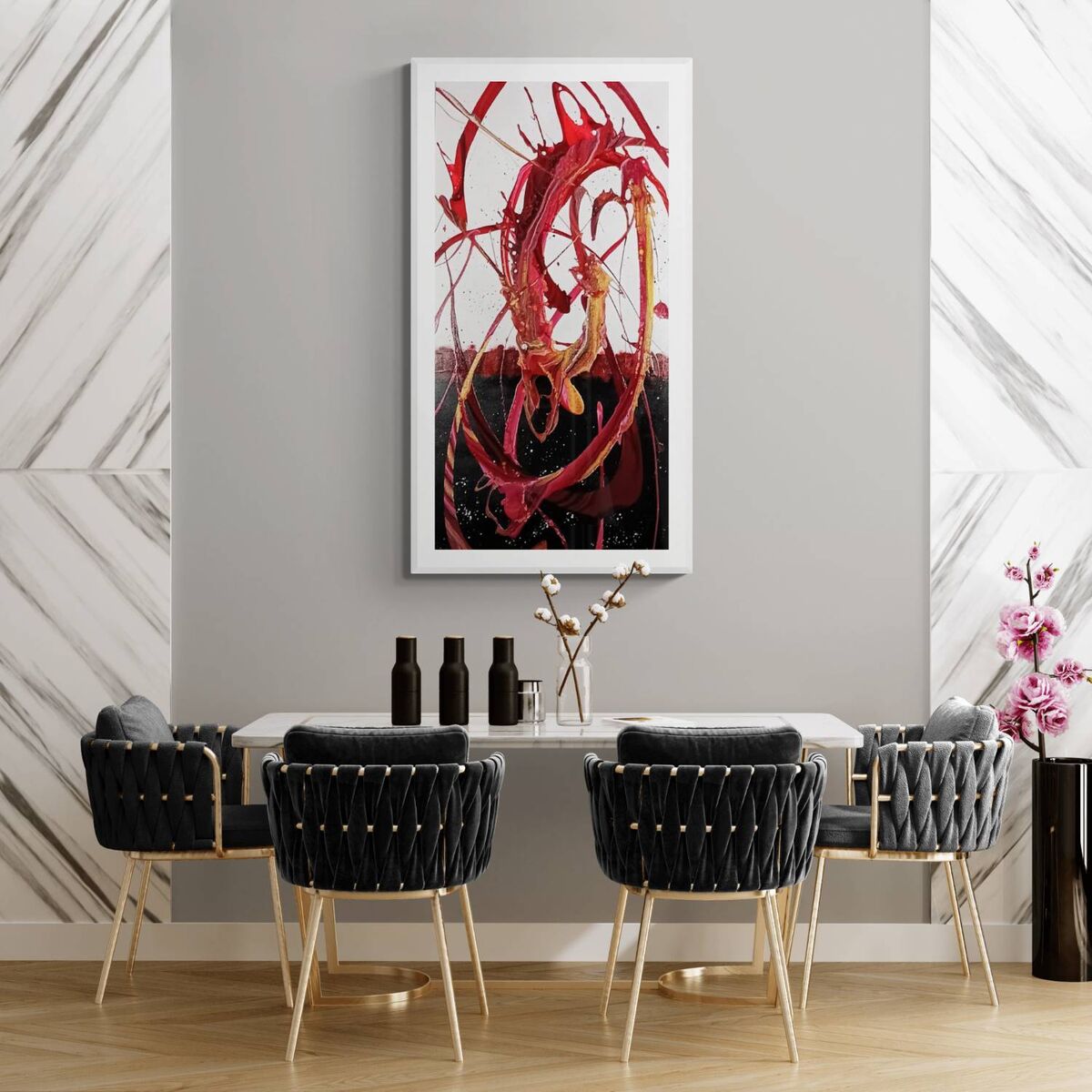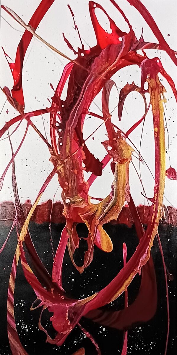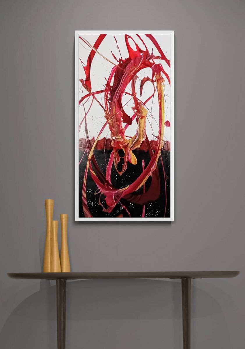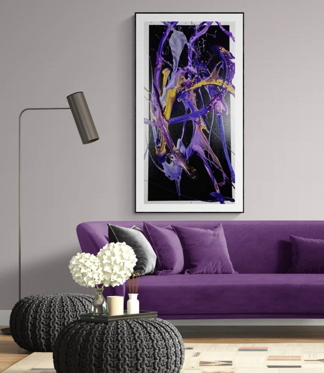 Experience the captivating world of abstract art with "Passion". This work of piece features a unique blend of vivid colors - purple, violet, silver, and gold - set against a striking black background. The layers of colors are intricately woven together, creating a mesmerizing effect that draws you in deeper and deeper. It's impossible not to feel the essence of passion when admiring this piece. So, take a moment to lose yourself in its captivating beauty and let your imagination run wild.