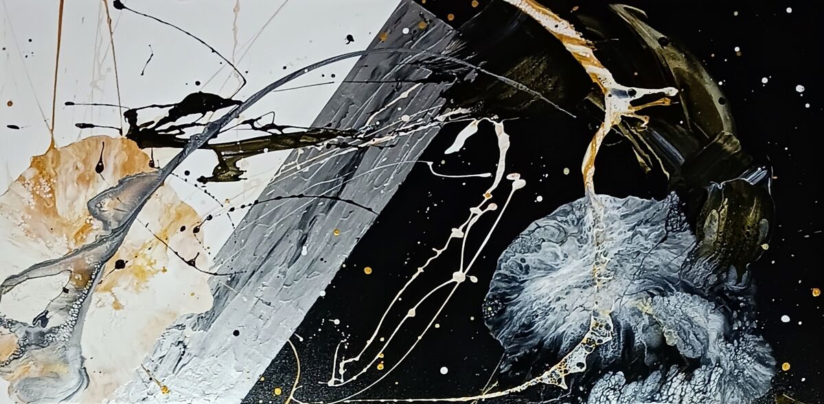 Connection is a striking artwork that showcases a captivating black and white background, adorned with shades of gold, silver, white, and black that extend across a textured silver divide. This piece is a true representation of human connection, and the power that is created when we come together. The stunning blend of colors and textures symbolizes the beauty that can be found in unity, and the strength that emerges when we work in unison. This artwork is truly mesmerizing, and serves as a testament to the power of connection in our lives.