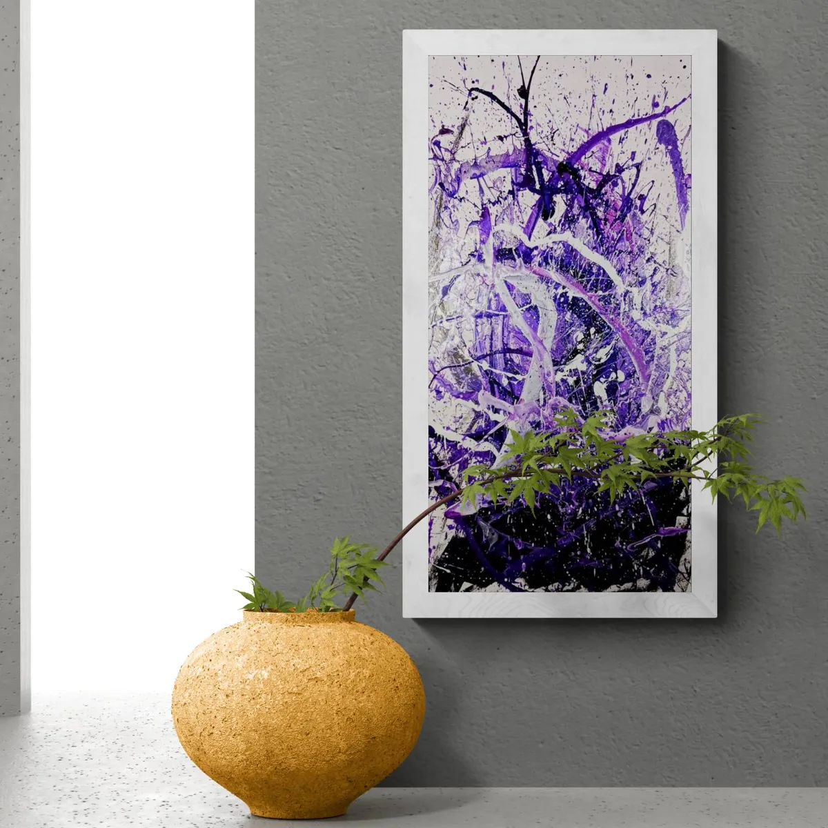 The contrasting black and white background sets the stage for a captivating performance, where shades of purple and silver come together in a joyful dance!