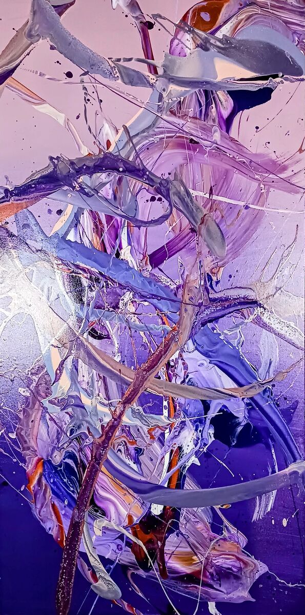 "Ethereal" is a captivating abstract painting that evokes a sense of delicate enchantment and cosmic wonder. Against a muted black backdrop, gold leaf geometric shapes intricately weave across the canvas, their shimmering presence drawing the eye into a mesmerizing dance. Dynamic splashes of gold, white, shades of purple, and black add layers of depth and movement to this composition, creating an interlaced tapestry of colors that harmonize in an otherworldly symphony. The delicate balance between the bold geometric forms and the fluidity of the splashes lends a sense of both structure and spontaneity to the piece.